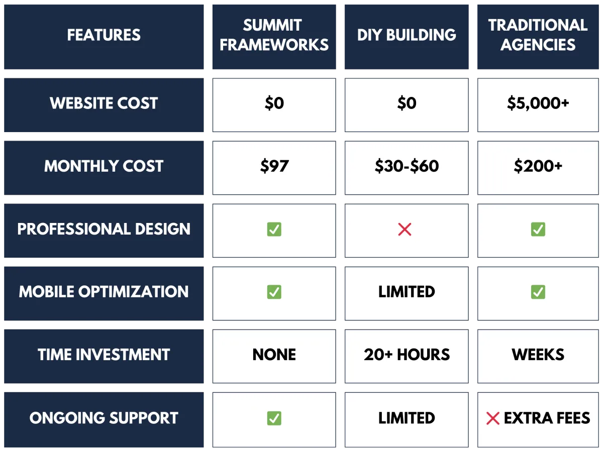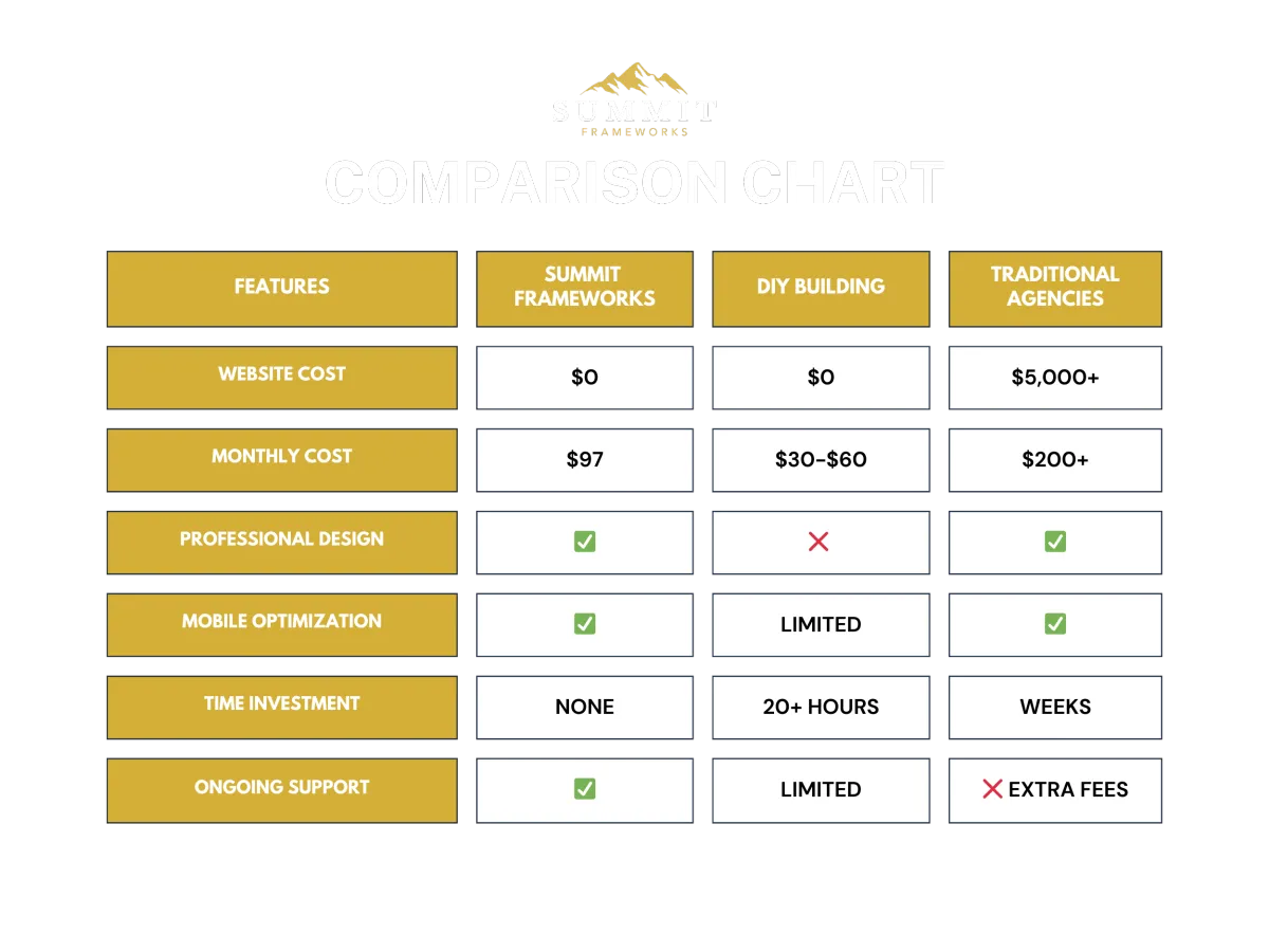 At Summit Frameworks, we're eliminating the biggest barrier to getting online — the upfront cost. We will build your custom website completely FREE when you host with us for just $97/month.